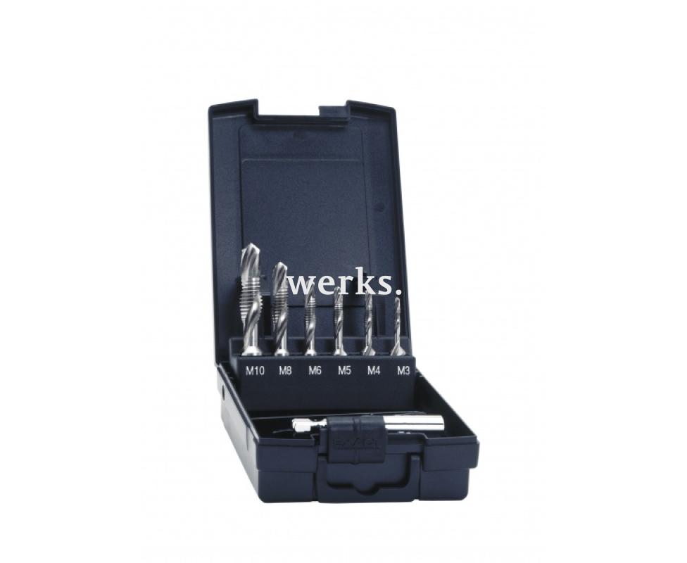 Комплект из 6 комбинированных метчиков-бит предназначен для сверления отверстий под резьбу, нарезания резьбы и удаления заусенцев в одном процессе. Хвостовик имеет шестигранную форму размером 1/4'. В набор входит адаптер-битодержатель. Упакован в компактный пластиковый контейнер с шарнирным механизмом для удобного открывания.