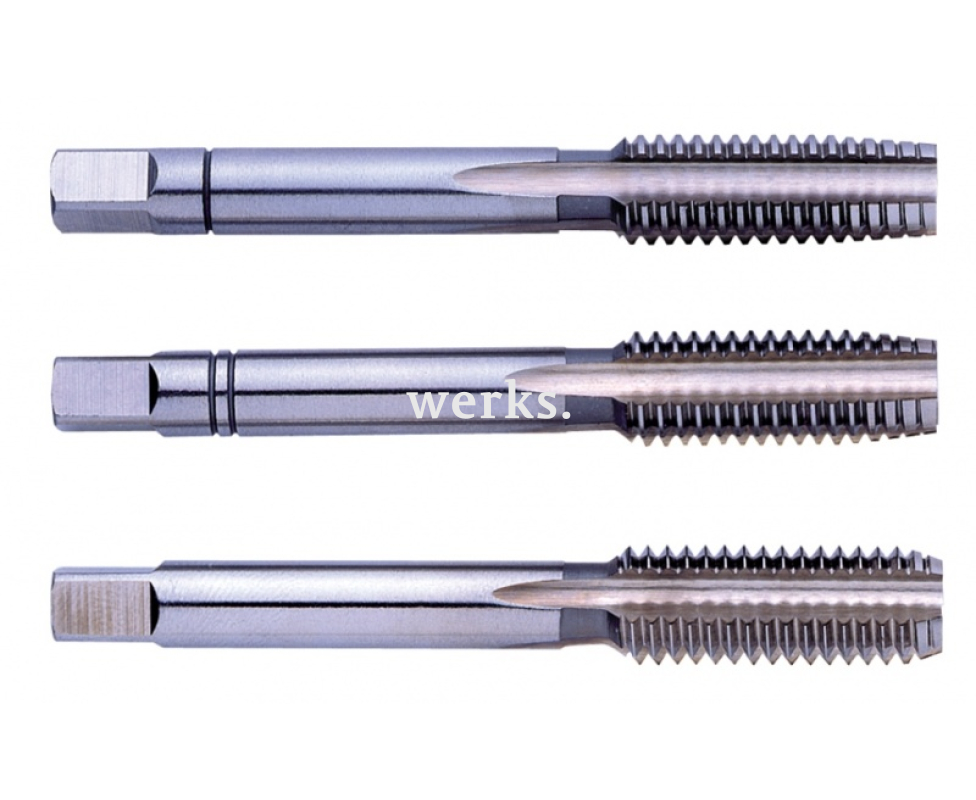Комплект из трех одноходовых бит-метчиков (грубый, промежуточный, финишный) с квадратным приводом, предназначенный для создания метрической трапециедальной резьбы. Изготовлены из быстрорежущей стали HSSG. Допуск 7H.