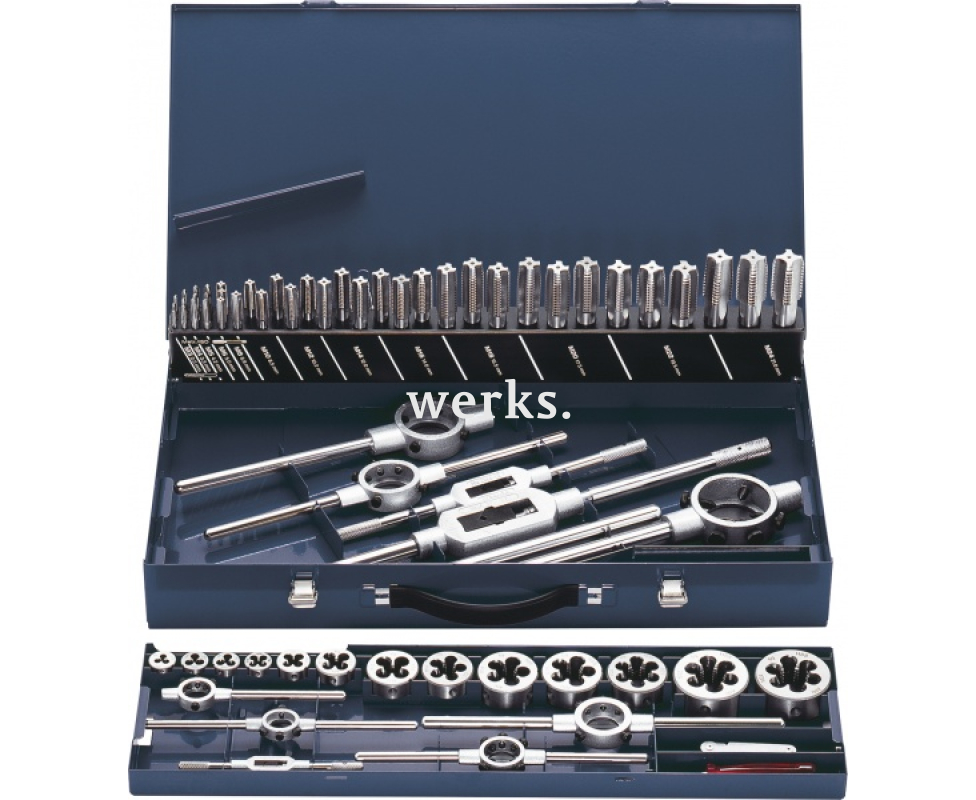 Комплект из 62 метчиков однопроходного типа (черновые, средние и чистовые) из быстрорежущей стали HSS с воротками, а также плашек и плашкодержателей различных размеров. Он предназначен для нарезки как внешней, так и внутренней метрической резьбы по стандарту ISO DIN 13. Допуск 6H. Упакован в компактный и прочный кейс, что делает его удобным для хранения и транспортировки инструмента.