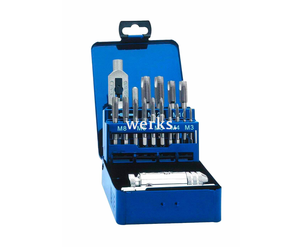 Комплект однопроходных бит-метчиков (по 2 единицы каждого размера) с квадратным приводом для создания метрической резьбы. Изготовлены из быстрорежущей стали HSS с допуском 6H. В набор входит вороток 1 1/2' и адаптер для бит. Упакованы в компактный стальной ящик с шарнирным механизмом открытия. 20331
