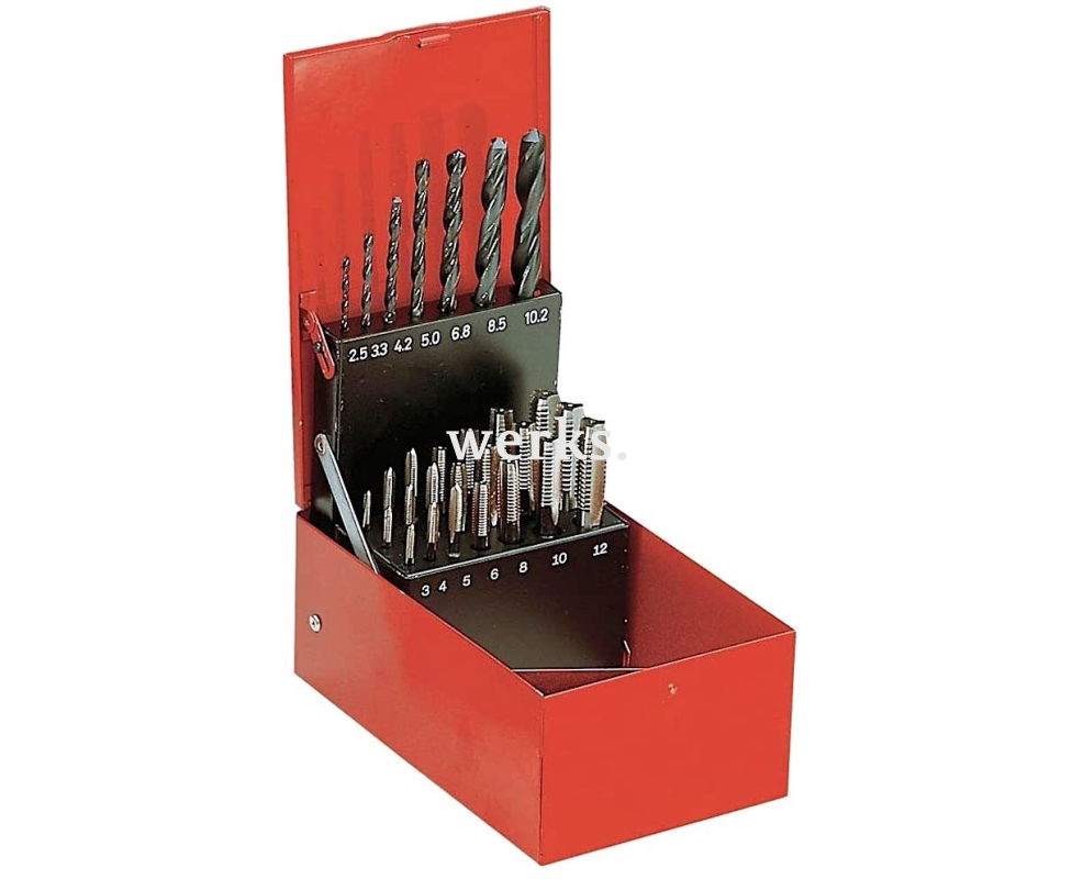 В комплект входят 7 спиральных сверл, изготовленных из высококачественной быстрорежущей стали HSS с цилиндрическим хвостовиком, с диапазоном диаметра сверления от 2,5 до 10,2 мм. Также в набор включены 21 кобальтовый метчик размером от М3 до М12 (по 3 метчика каждого размера: черновой, промежуточный и чистовой). Набор поставляется в прочном стальном кейсе BT.228J2 размером 172x105x57 мм.