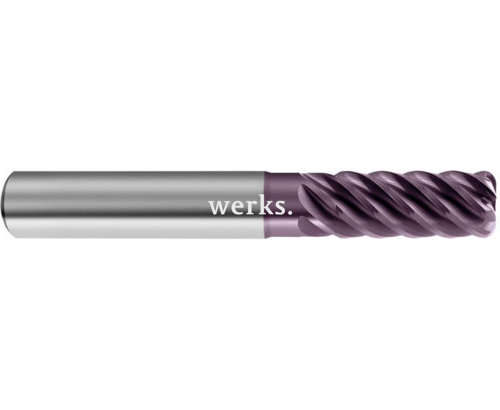 Многозубые концевые фрезы с радиусом угла GH 100 U, соответствующие стандарту DIN 6527L, предназначены для правостороннего резания. Эти инструменты имеют зазор между шейками и не предназначены для резки по центру. Внутреннее охлаждение отсутствует, а допуск по диаметру составляет h10. Режущий материал фрезы выполнен из твердого карбида.