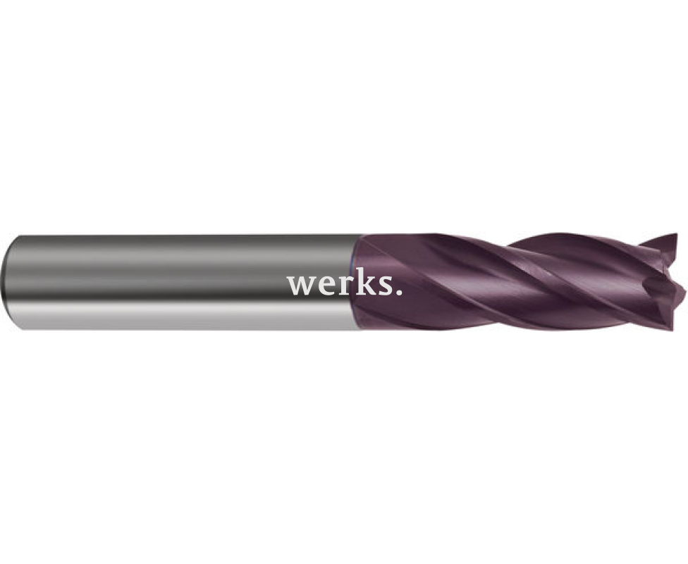 Концевые фрезы с четырьмя канавками, соответствующие стандарту DIN 6527L, предназначены для правостороннего резания. Они имеют центральное исполнение и не оснащены внутренним охлаждением. Допуск по диаметру составляет h10, а режущий материал — твердый карбид.
