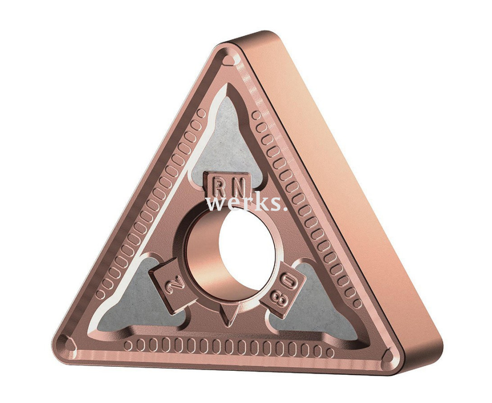 Пластина TNMG 160412 для точения с высокими подачами. Усиленная марка KCP25B обеспечивает повышенную стойкость к ударам при черновой обработке сталей с большими глубинами резания.