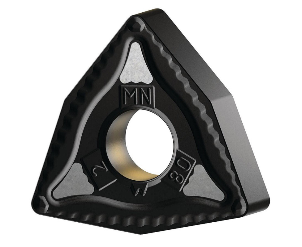 Шестигранная пластина WNMG 060404 со стружколомом MN для получистового точения. Универсальная марка KCP25 обеспечивает отличный баланс износостойкости и прочности при работе со сталями. Подходит для стабильной обработки с средними режимами резания.