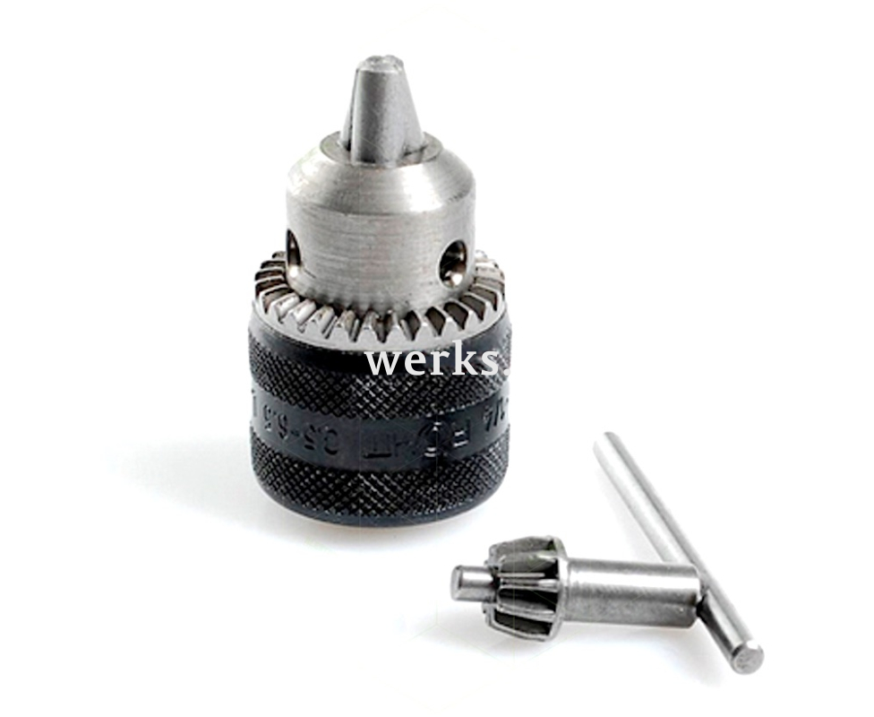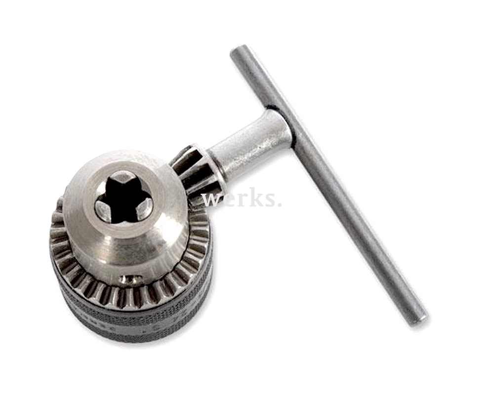 Эффективно и безопасно удерживает насадки. Оснащен тремя точно обработанными поверхностями. Диаметр хвостовиков составляет 0,5-6 мм. Максимальная скорость вращения достигает 10 000 об./мин. Предназначен для быстрой и надежной фиксации хвостовиков сменных насадок. Имеет резьбу 3/8', совместим с настольным сверлильным станком ТВМ 220. В комплект входит патронный ключ.
