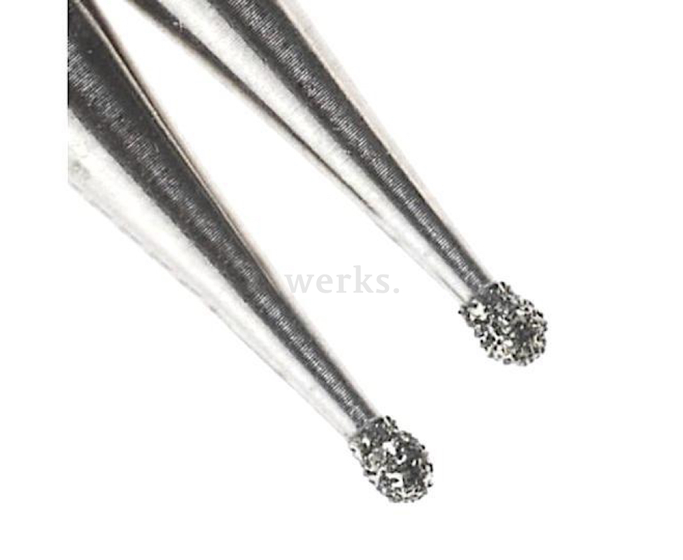 Два бора с круглым наконечником, изготовленные из высококачественной нержавеющей стали и покрытые равномерным слоем алмаза. Длина составляет 44 мм, вал имеет диаметр 2.35 мм, а диаметр алмазного наконечника равен 1.0 мм. Максимальная скорость вращения достигает 300 000 об./мин. Инструмент предназначен для шлифовки и гравировки различных материалов, включая стекло, сталь (в том числе хром-кобальтовый сплав), фарфор, керамику и пластик.