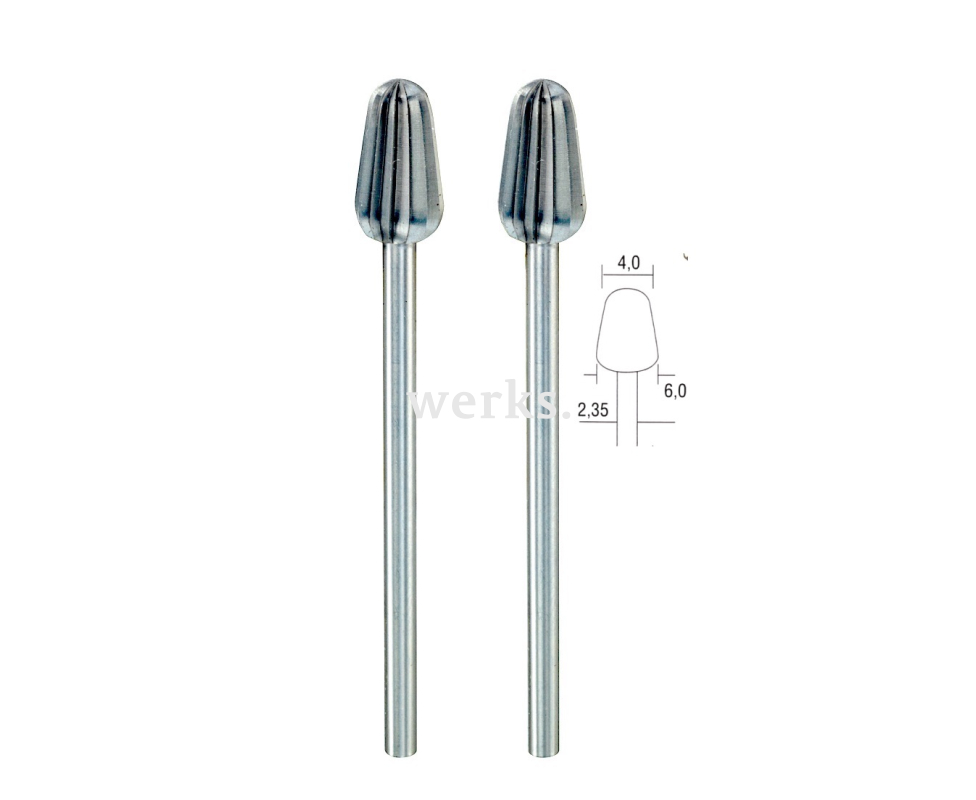 Две конусные фрезы, изготовленные из высокопрочной вольфрам-ванадиевой стали. Рабочая часть и хвостовик выполнены из одной заготовки. Длина составляет 50 мм, вал имеет диаметр 2.35 мм, а диаметр рабочей части варьируется от 4 до 6 мм, толщина - 13 мм. Для точной и надежной фиксации фрез рекомендуется применять стальные цанги Micromot. Максимальная скорость вращения достигает 8 000 об./мин. Эти фрезы предназначены для обработки изделий из цветных и драгоценных металлов, древесины, пластиков и гипса.