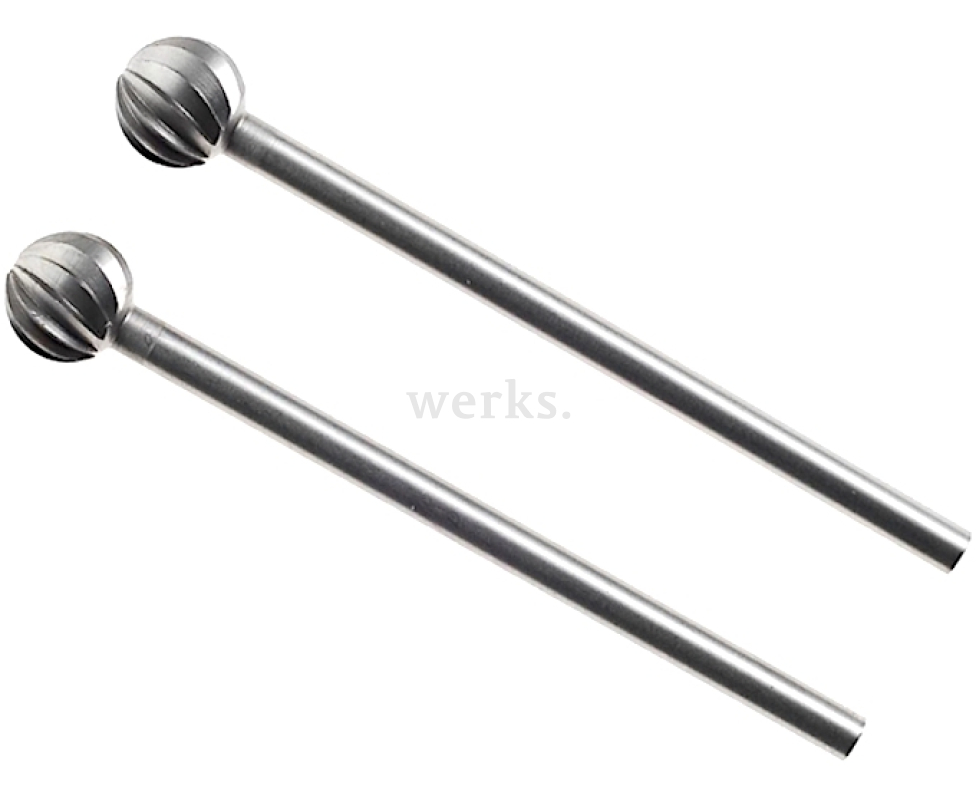 Две сферические фрезы, изготовленные из высокопрочной вольфрам-ванадиевой стали. Рабочая часть и хвостовик выполнены из одной заготовки. Длина составляет 50 мм, вал имеет диаметр 2.35 мм, а диаметр рабочей части равен 6 мм. Для точной и надежной фиксации фрез рекомендуется применять стальные цанги Micromot. Максимальная скорость вращения достигает 8 000 об./мин. Эти фрезы предназначены для обработки изделий из цветных и драгоценных металлов, древесины, пластиков и гипса.