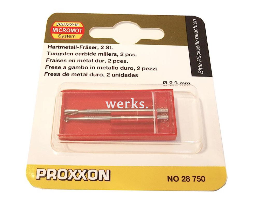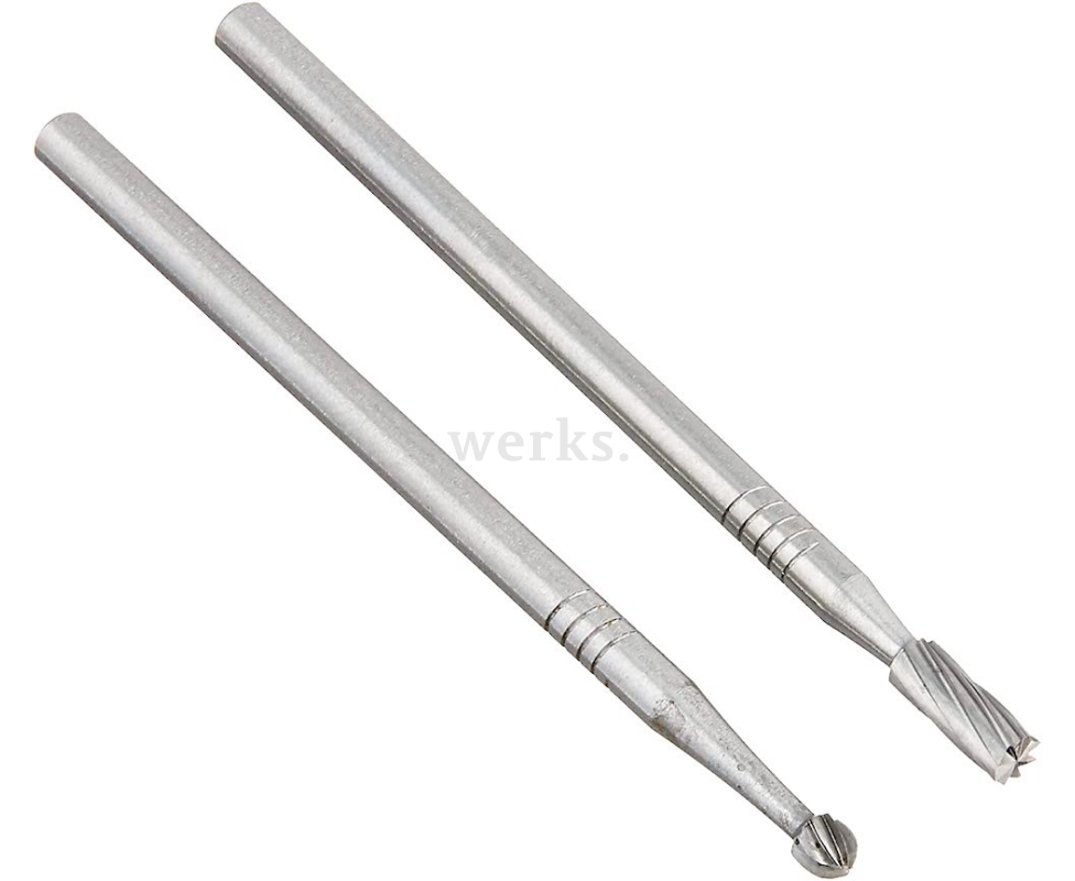 Две фрезы (сферическая и цилиндрическая) изготовлены из высокопрессованного мелкозернистого карбида вольфрама. Длина составляет 44 мм, вал имеет диаметр 2.35 мм, а рабочая часть - 2.3 мм. Хвостовик и рабочая часть выполнены из одной заготовки. Максимальная скорость вращения достигает 100 000 об./мин. Эти фрезы предназначены для обработки стали, цветных металлов, стекла, пластика и углепластика.