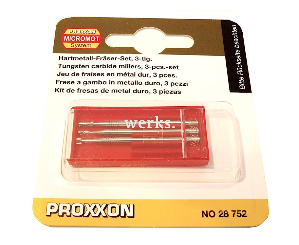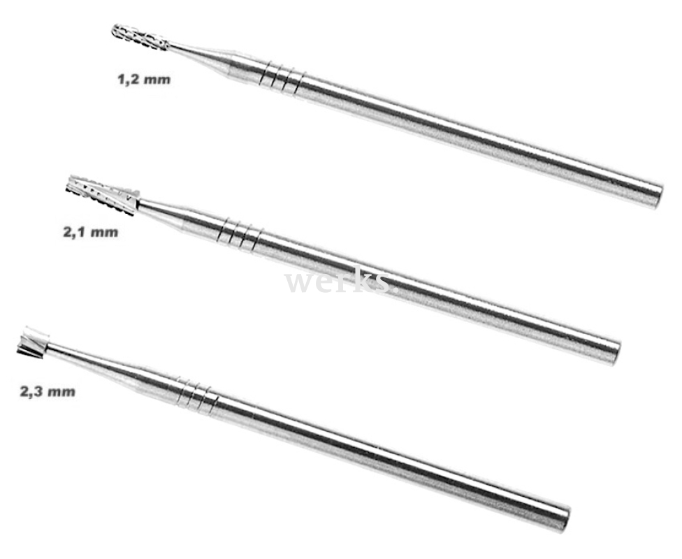 Три фрезы (сфера Ø2.3 мм, усеченный конус Ø2.1 мм и цилиндр Ø1.2 мм) изготовлены из высокопрессованного мелкозернистого карбида вольфрама. Длина составляет 44 мм, вал имеет диаметр 2.35 мм. Рабочая часть и хвостовик выполнены из одной заготовки. Максимальная скорость вращения достигает 100 000 об./мин. Эти фрезы предназначены для обработки стали, цветных металлов, стекла, пластика и углепластика.