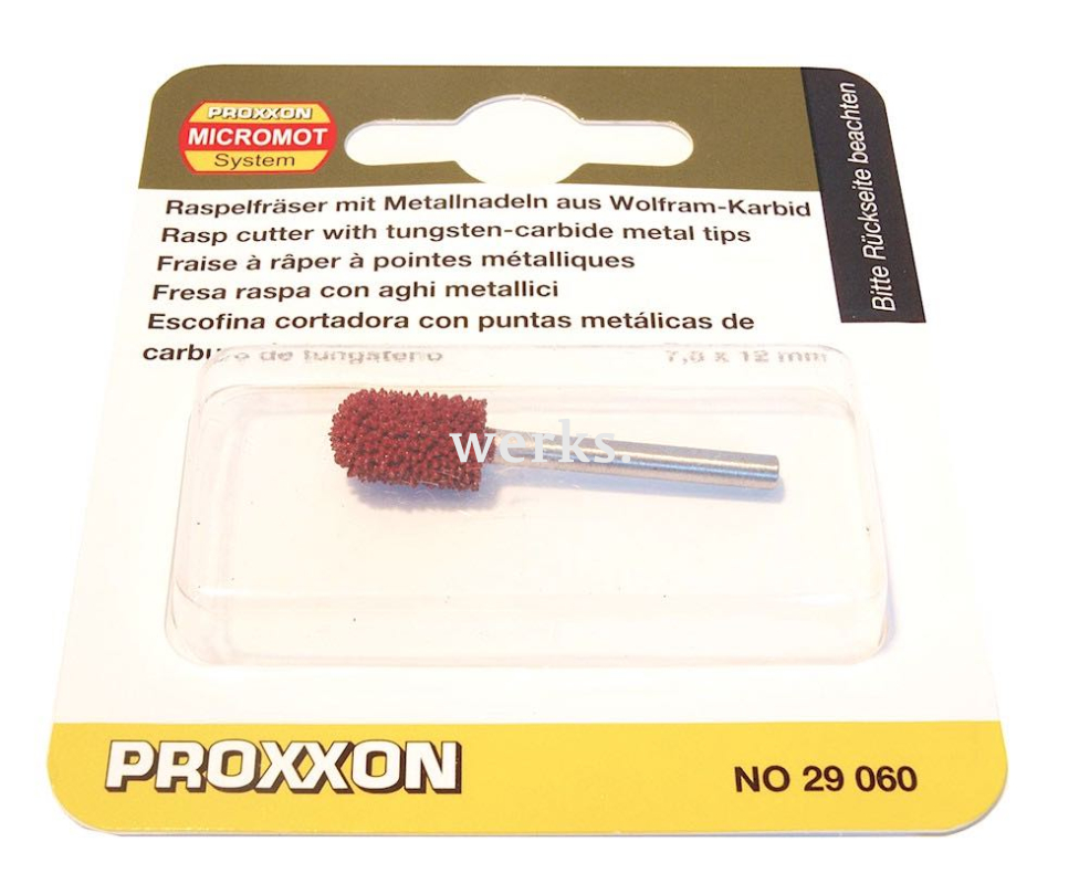 Цилиндрическая рашпильная фреза с округлой головкой, изготовленная из мелкозернистого карбида вольфрама. Ее длина составляет 44 мм, вал имеет диаметр 3.2 мм, а рабочая часть — 7.5 мм с длиной 12 мм. Удобно очищается с помощью горелки Бунзена. Максимальная скорость вращения достигает 30 000 об./мин. Инструмент предназначен для обработки древесины, резины, вспененных материалов, силикона, стекловолокна и поролона. Не рекомендуется для фрезеровки металлических изделий.