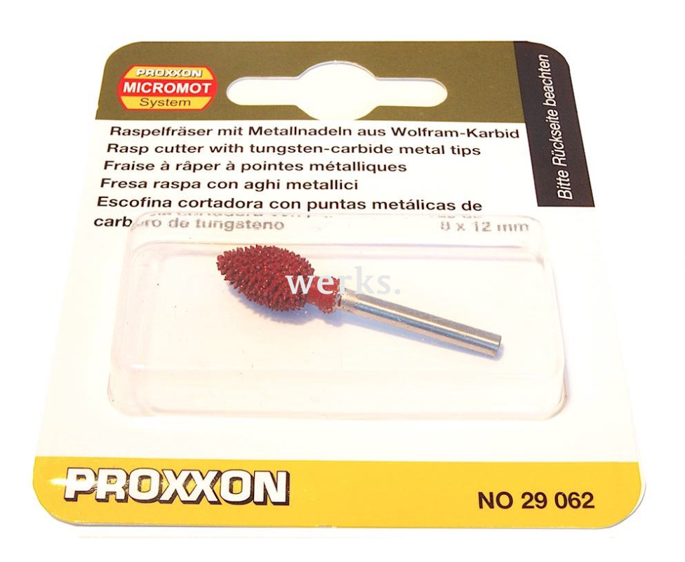Фреза рашпильная в форме пули, изготовленная из мелкозернистого карбида вольфрама. Ее длина составляет 44 мм, вал имеет диаметр 3.2 мм, а рабочая часть — 8 мм с длиной 12 мм. Удобно очищается с помощью горелки Бунзена. Максимальная скорость вращения достигает 30 000 об./мин. Этот инструмент предназначен для обработки таких материалов, как дерево, резина, пена, силикон, стекловолокно и поролон. Не рекомендуется для фрезеровки металлических изделий.