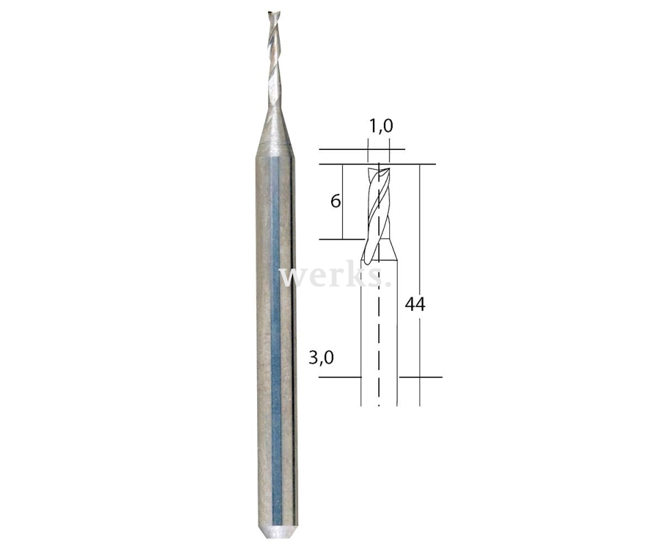 Двухзаходная фреза с заточкой, направленной к центру, изготовлена из высокопрессованного мелкозернистого карбида вольфрама. Ее длина составляет 44 мм, вал имеет диаметр 3.0 мм, а рабочая часть — 1.0 мм с длиной 6 мм. Хвостовик и рабочая часть выполнены из одной заготовки. Максимальная скорость вращения достигает 20 000 об./мин. Этот инструмент предназначен для обработки чугуна, закаленного чугуна, стали, стального литья, цветных металлов, стекла, пластика и углепластика.