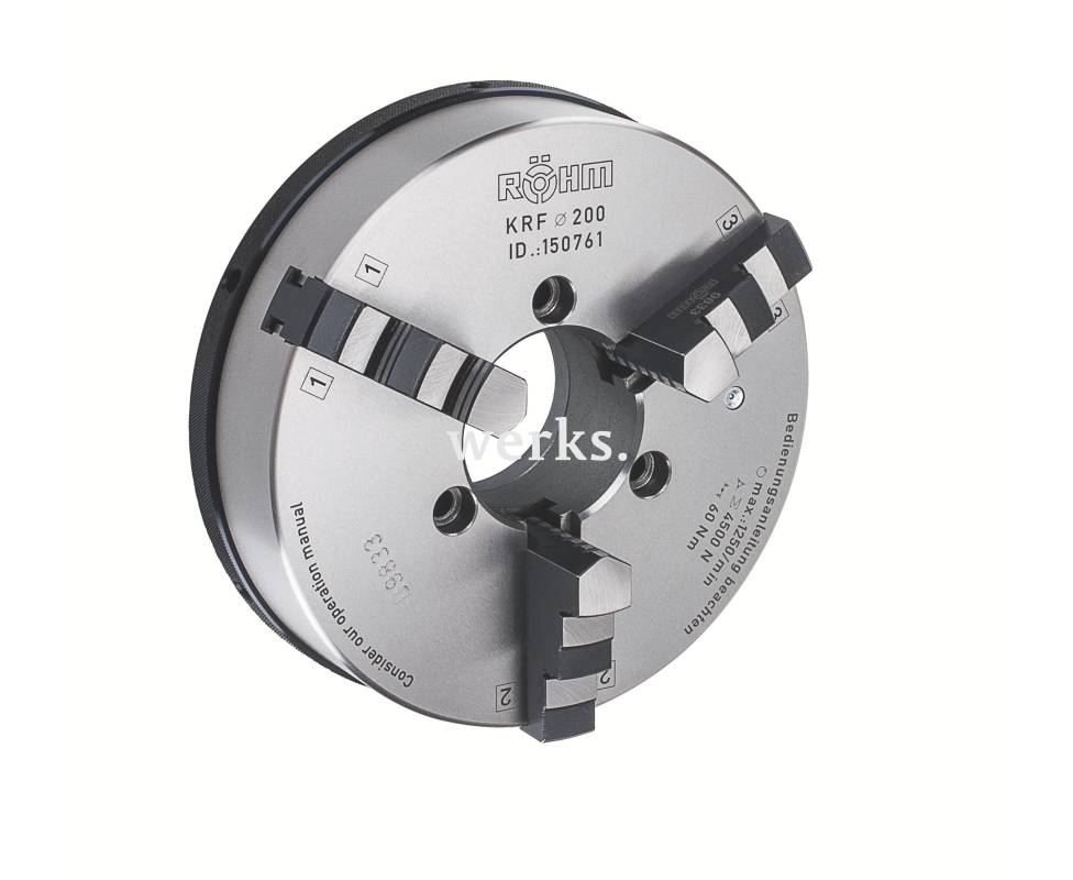 Патрон рычажный спиральный KRF, размер 200, 3 кулачка, зажимной штифт, корпус из чугуна Rohm 150761. Производство Röhm (Roehm), Германия.