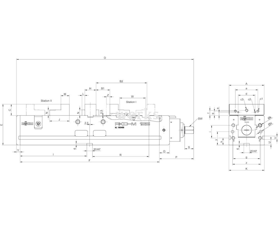 Компактные двойные тиски NC RKD-M, ширина губок 92, реверсивные ступенчатые губки + центральная губка Rohm 180468. Производство Röhm (Roehm), Германия.