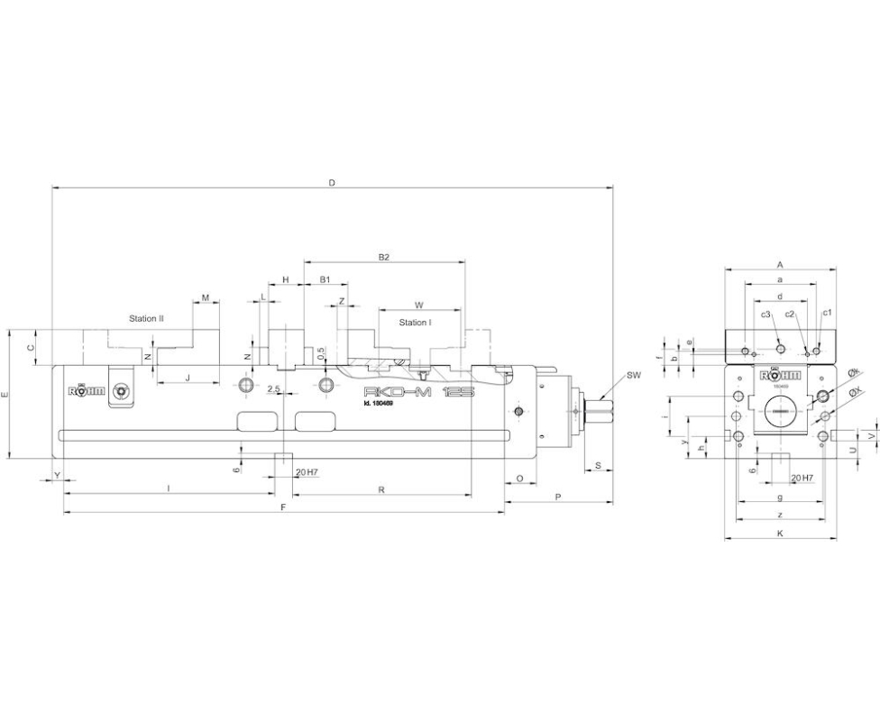 Компактные двойные тиски NC RKD-M, ширина губок 125, реверсивные ступенчатые губки + центральная губка Rohm 180469. Производство Röhm (Roehm), Германия.