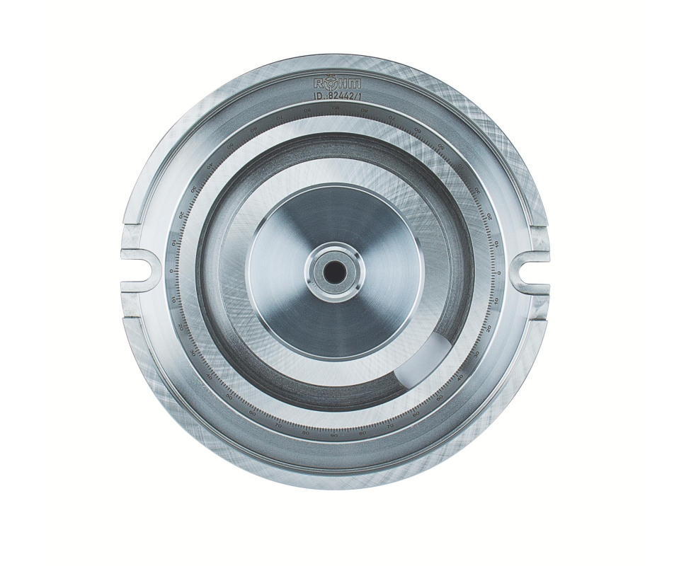 Стандартная поворотная пластина, размер 2, крепежные винты + гайки с Т-образным пазом, шлифованная контактная кромка, градуировка Rohm 082441. Производство Röhm (Roehm), Германия.