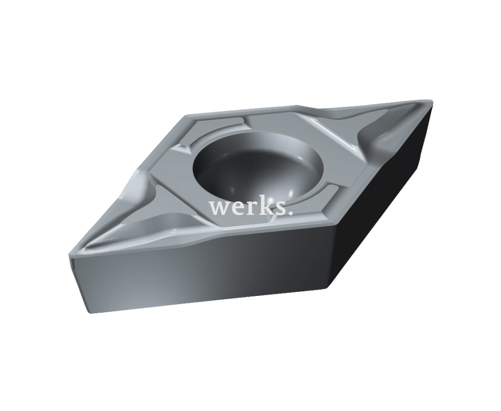 Твердосплавная сменная пластина DCMT для точения металлов имеет ромбическую форму с углом 55°. Она оснащена стружколомом и отверстием под винт (40-60°). Задний угол составляет 7° (позитивный). Допуски: m: ±0.08-±0.18, D1: ±0.05-±0.15, S1: ±0.13. Пластина выполнена из кермета без покрытия, предназначена для чистовой обработки с высокими требованиями к качеству поверхности. Рекомендуемое значение fn x ap составляет менее 0,35 мм². Обрабатываемый материал по классификации ISO: P10 (P01-P20). Идеально подходит для чистового точения с отличным контролем стружкообразования для всех типов сталей, обеспечивая низкие силы резания благодаря остроте режущей кромки.