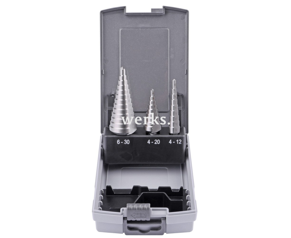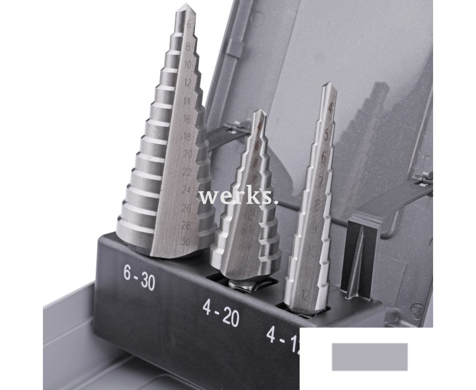 Набор ступенчатых свёрл 4-12 4-20 6-30 mm, HSSE, прямое Werks W.8020060