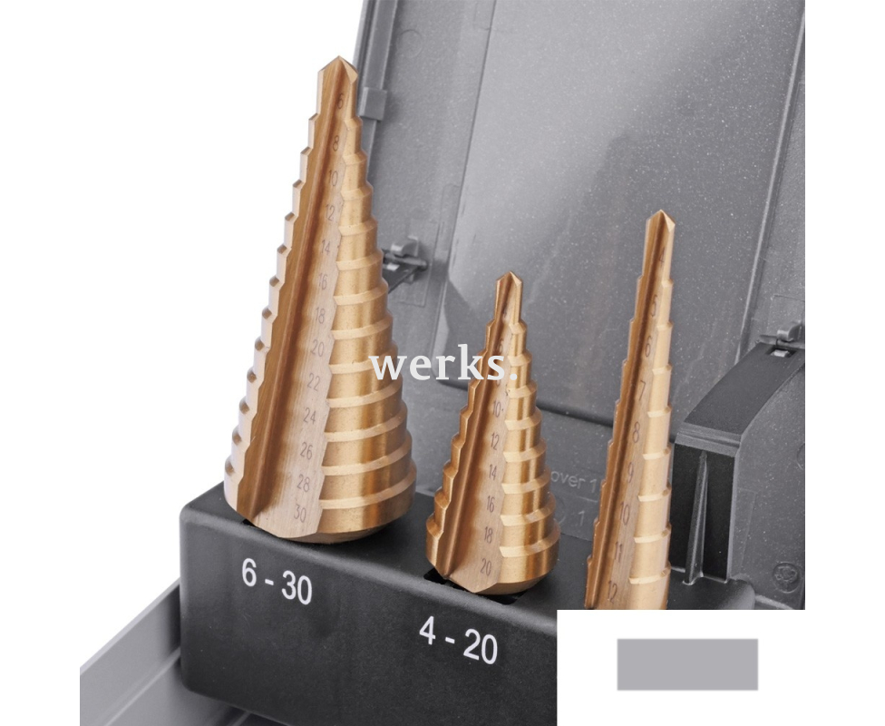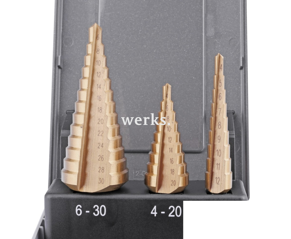 Набор ступенчатых свёрл 4-12 4-20 6-30 mm, HSSE TiN, прямое Werks W.8020080