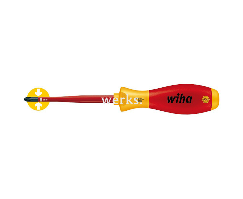 Отвертка Wiha SoftFinish electric slimFix Phillips 3211 35394 PH2 x 100, длина 218 мм и рабочая часть 100 мм, предназначена для профессионального использования. Она прошла тестирование на соответствие стандартам VDE и соответствует требованиям IEC 60900. Оснащена рабочим наконечником Wiha ChromTop.