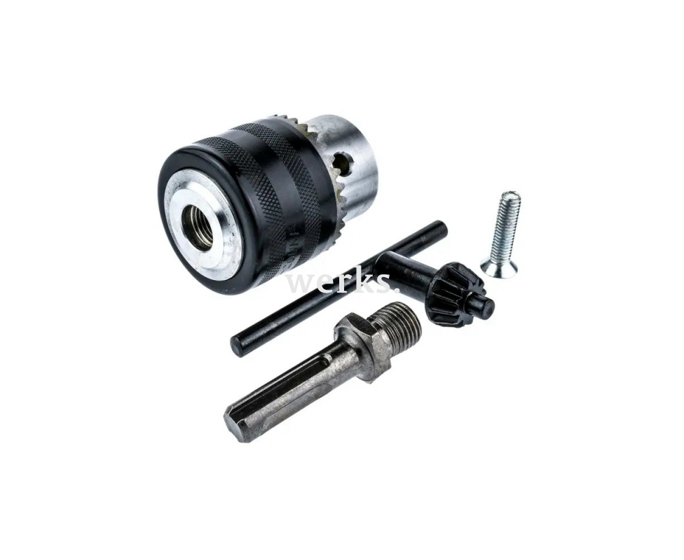 Быстрозажимной патрон DeWALT DT7005-QZ с диапазоном зажима 1-13 мм и конусом Морзе B12 предназначен для установки на дрели и смесители мощностью до 1500 Вт. Трехкулачковый механизм из закаленной стали 20Х с твердостью кулачков 58 HRC обеспечивает биение не более 0.03 мм. Двухгильзовая система с нейлоновой втулкой позволяет затягивать патрон вручную с усилием 120 Н·м. Внешний корпус из хром-ванадиевой стали с резиновым покрытием Comfort Grip диаметром 65 мм обеспечивает надежный хват.