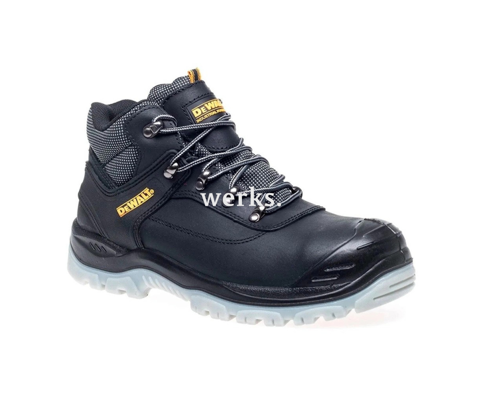 Рабочие ботинки DeWALT DWF50031-122-11 класса S3 с противоударным носком (200 Дж) и антипрокольной подошвой. Верх из гидрофобной кожи 2.8 мм с мембраной DryTech. Подошва из термополиуретана с протектором ExtremeGrip. Размер 44, соответствие стандартам EN ISO 20345:2011.
