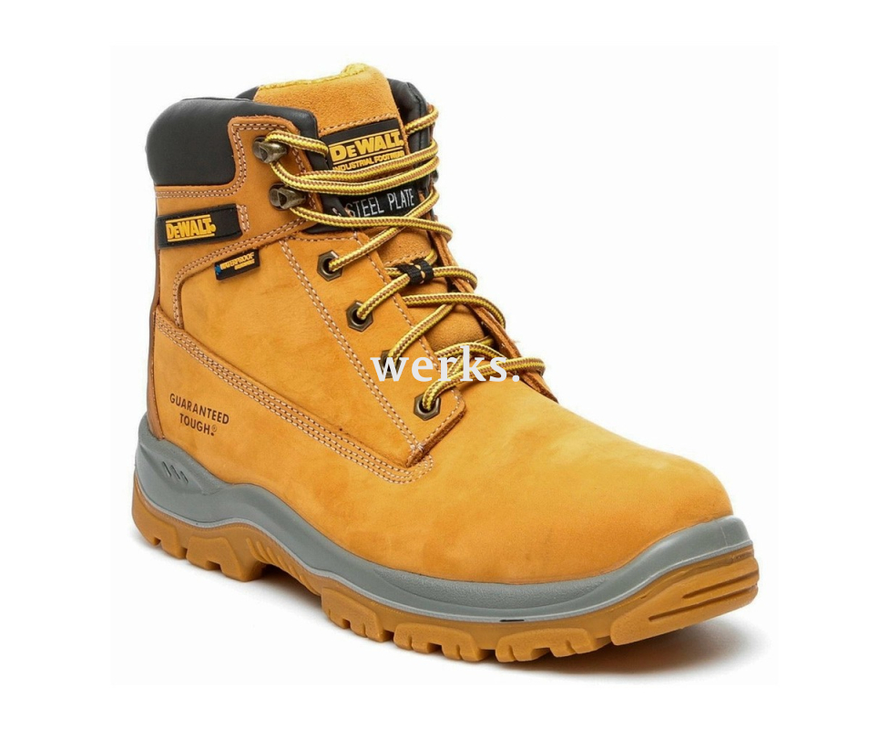 Рабочие ботинки DeWALT DWF50092-123-8 класса S1P с противоударным носком (200 Дж) и антипрокольной подошвой. Верх из водоотталкивающей кожи 2.2 мм с мембраной DryGuard. Подошва из термополиуретана с маслостойким покрытием и амортизирующей пяткой ShockAbsorb. Размер 42, соответствие стандартам EN ISO 20345:2011.