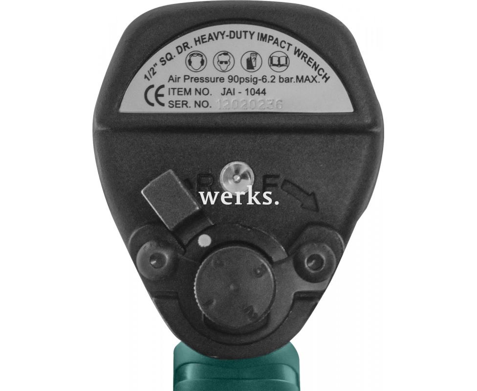 Пневматический ударный гайковерт с легкосплавным металлическим корпусом, покрытым ударопрочной эмалью, нанесенной электростатическим методом. Резиновая накладка на рукоятке уменьшает вибрацию, воздействующую на руку пользователя. Этот гайковерт предназначен для работы с сложными и нагруженными соединениями с резьбой до М16 и максимальным моментом затяжки 780 Нм. При использовании пневматических ударных гайковертов рекомендуется надевать перчатки с виброгасящими вставками, а также средства защиты для глаз и ушей. Присоединительный квадрат составляет 1/2 дюйма, частота свободного вращения — 8000 об/мин, максимальный крутящий момент — 780 Нм, рабочий крутящий момент — 650 Нм. Максимальное давление в магистрали — 6,2 кгс/см², циклический расход воздуха — 119 л/мин, диаметр воздушного шланга — 10 мм, штуцер — 1/4 дюйма. Размеры: длина 202 мм, масса 2,6 кг. Механизм привода — двойной молоток, уровень шума — 90 дБ, вибрация — 3,6 м/с².