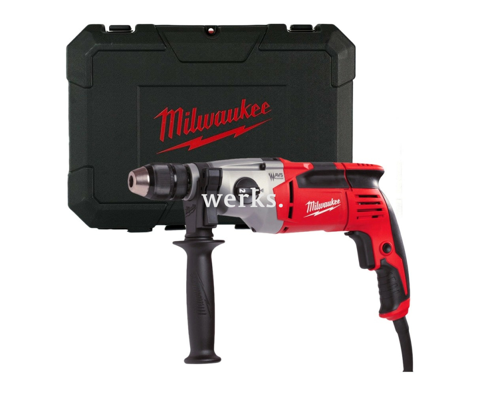 Дрель Milwaukee PD2E 24 R (4933419595) с ударным механизмом 3,5 Дж. Электронная регулировка оборотов 0-1100/0-3000 об/мин. Бесщеточный двигатель 750 Вт. Встроенный фонарь 20 люмен.