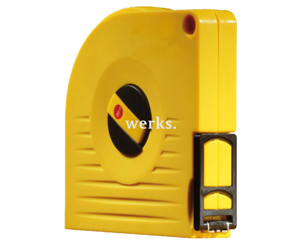 Корпус из ударопрочного нейлона. Точность III класса. Измерительная лента выполнена из стекловолокна и имеет прочное пластиковое покрытие с односторонней шкалой. Красные цифры, кратные 10, выделены для удобства. Деление первого метра представлено в миллиметрах. Универсальный крючок на нулевой отметке оснащен специальной проушиной для быстрого захвата на шляпке гвоздя. Складная скрытая рукоятка барабанного типа.