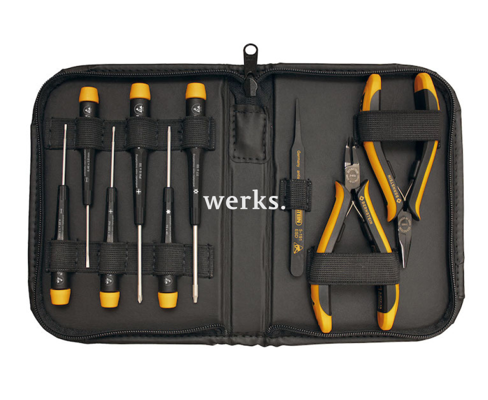 Комплект включает 9 антистатических прецизионных инструментов: кусачки, длинногубцы, острый пинцет, а также прецизионные отвертки типов SL, PH и TORX. Он идеально подходит для работы с деликатной механикой и электроникой, подверженной воздействию электростатического разряда. Инструменты поставляются в компактной мягкой ESD-сумке на молнии размером 190 х 135 х 35 мм.