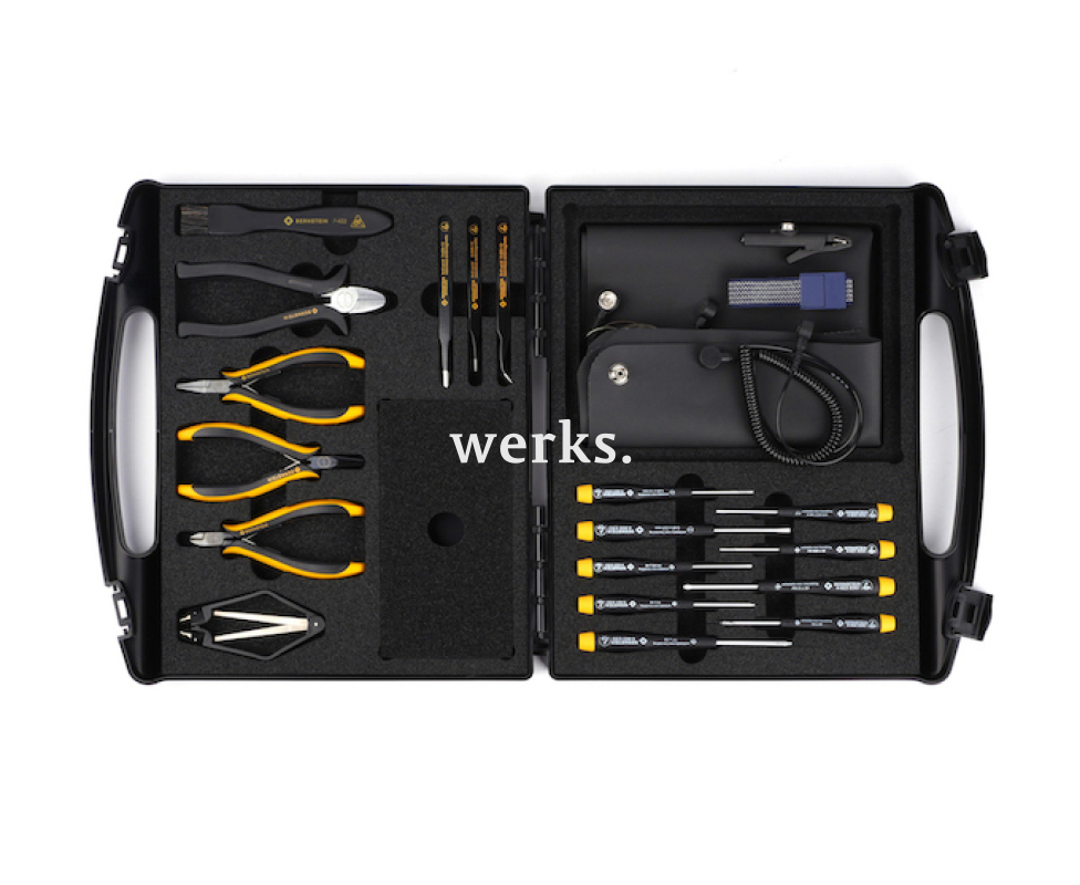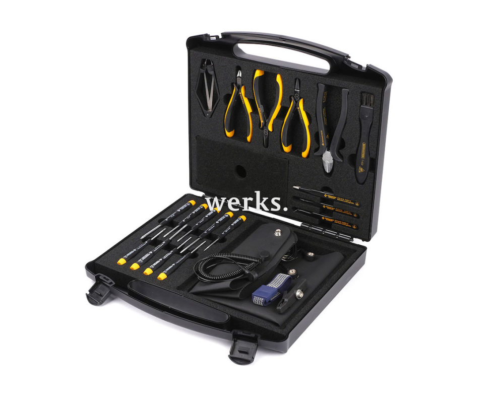 Набор включает 19 высокоточных антистатических инструментов. В него входят: заземляющий коврик с браслетом, кусачки, пинцеты из нержавеющей стали, плоскогубцы, прецизионные отвертки SL, PH и TORX, экстрактор для микросхем и кисточка. Упакован в прочный пластиковый ESD кейс размером 350 х 310 х 65 мм с углом открытия 180°.