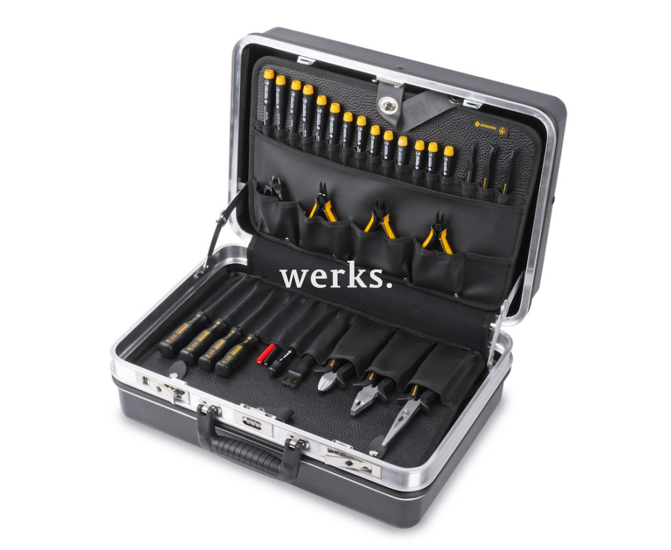 Набор включает 30 антистатических инструментов. В него входят: прецизионные бокорезы, кусачки, щипцы, плоскогубцы, пассатижи, три пинцета, пять шлицевых отверток (1.5, 2.0, 2.5, 4.0, 5.5), пять отверток TORX (Т4-Т9), пять крестовых отверток Phillips (РН000, РН00, РН0, РН1, РН2), три отвертки-торцовых ключа (М2, М4, М5.5), экстрактор микросхем, скальпель и кисточка. Набор поставляется в прочном кейсе с усиленным алюминиевым каркасом размером 500 х 370 х 210 мм, оснащенным двумя замками и кодовым замком. В кейсе достаточно места для хранения дополнительных инструментов и электронных компонентов.