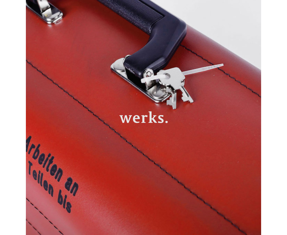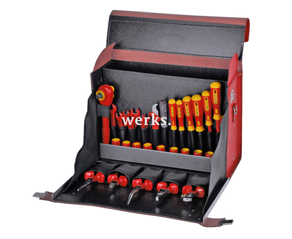 Комплект включает 35 диэлектрических инструментов. В него входят: индикатор напряжения, бокорезы, прямые и изогнутые узкогубцы, пассатижи, стриппер, 5 шлицевых отверток (3.5, 4.0, 5.5, 6.5, 8.0), 2 крестовые отвертки Phillips (РН1, РН2), нож для снятия изоляции, 9 торцевых головок 1/2' НЕХ М10 - М24, реверсивная трещотка, удлинитель, 7 рожковых гаечных ключей (М8 - М14), диэлектрические перчатки, пластиковый зажим с пружиной, ручка с манжетой для предохранителей NH. Все инструменты соответствуют стандартам VDE IEC 60900 / EN 60900 и безопасны для работы с оборудованием под напряжением до 1000 В переменного тока. Инструменты организованы в выдвижных отсеках и в поддоне. Поставляется в прочном кожаном чемодане размером 440 х 175 х 310 мм с замками и ключом, а также с наплечным ремнем.
