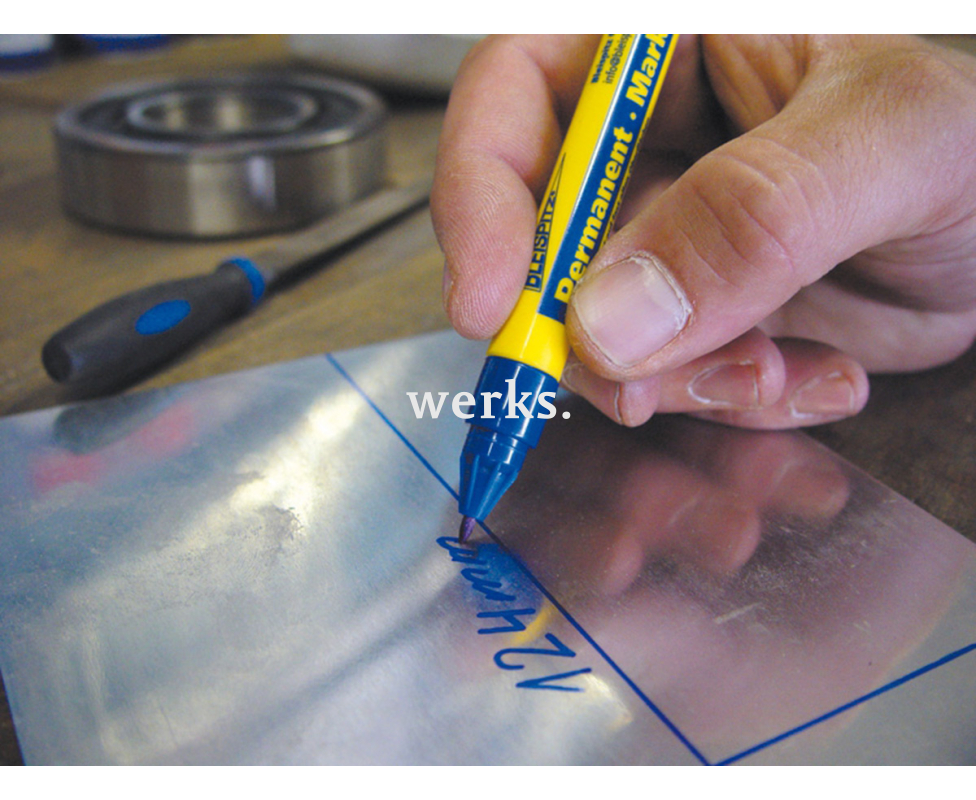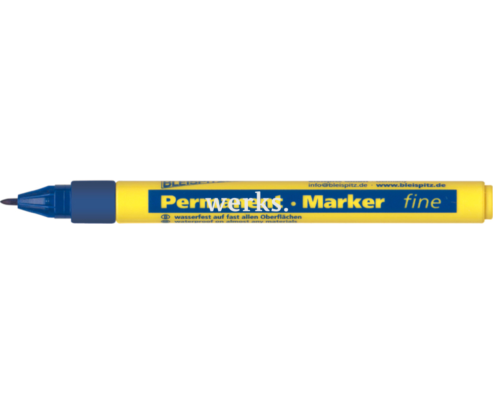 Профессиональный перманентный маркер для разметки Bleispitz 0778 синего цвета. Предназначен для маркировки на различных материалах. Ярко виден на пластике, картоне, стекле, резине, дереве, металле и других поверхностях. Обладает стойкостью к выцветанию и быстро сохнет. Не имеет резких запахов благодаря отсутствию ксилола и толуола в составе. Диаметр наконечника составляет 1 мм.