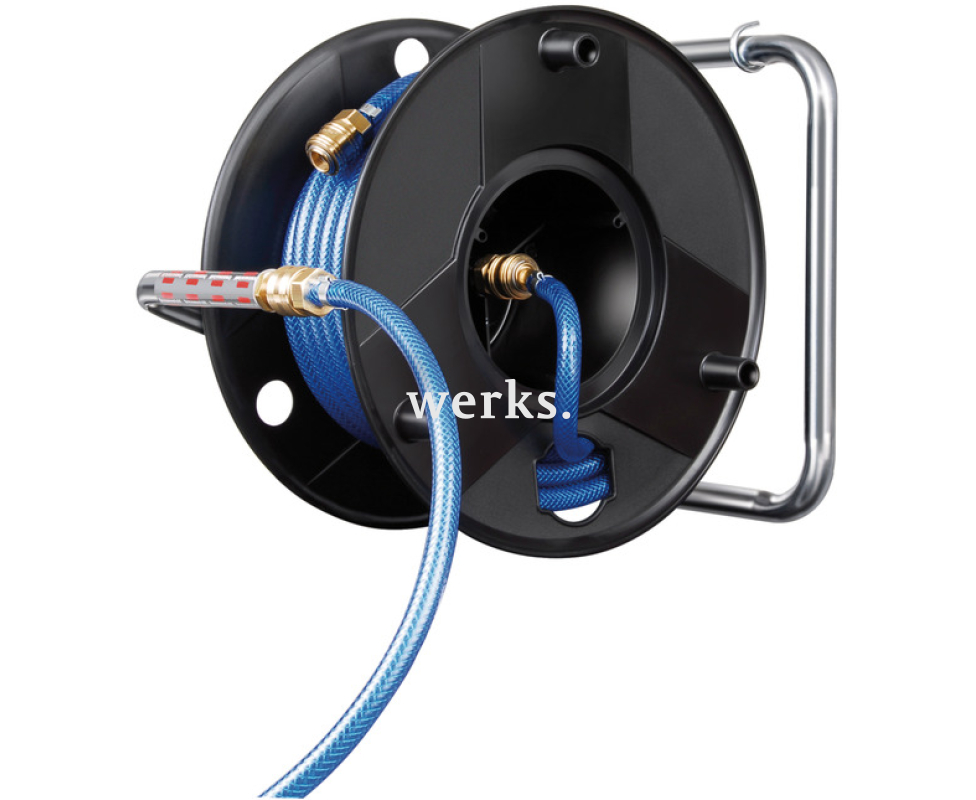 Воздушный шланг длиной 20 метров на катушке Brennenstuhl Anti Twist 1127010. Изготовлен из прочной ткани, устойчива к масляным веществам. Способен выдерживать давление до 15 атмосфер. Осевое подключение, а также автоматическое сматывание и разматывание в процессе эксплуатации. Быстросъемные соединения (DIN), соединительный шланг и настенное крепление.