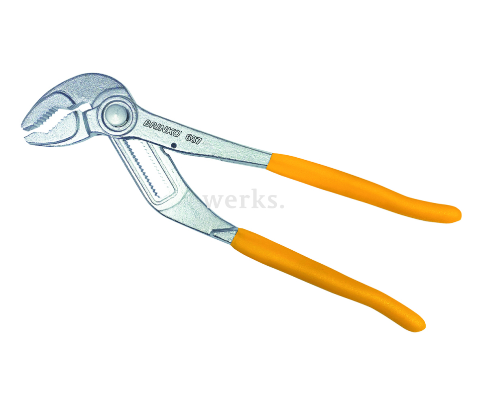 Профессиональные трубные клещи Brinko длиной 250 мм, модель 687 992798. Эти клещи изготовлены из высококачественной хром-ванадиевой стали и имеют закаленные захватные губки, а также 11-ступенчатый реечный механизм с автоматической настройкой размера. Они обеспечивают самоблокировку на трубах и гайках. Кнопка и пружина выполнены из нержавеющей стали. Также предусмотрено отверстие для горелки и защита пальцев от зажима.