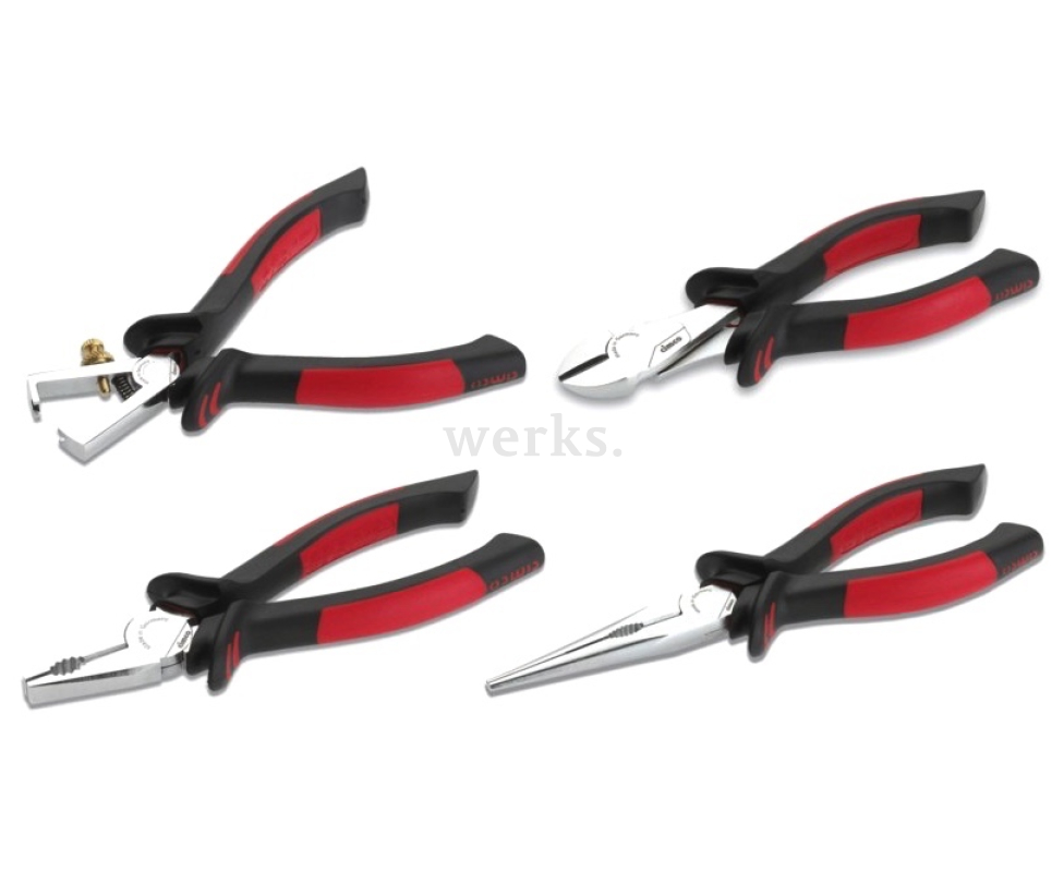 Комплект для электриков, включающий 4 диэлектрических инструмента: усиленные бокорезы длиной 200 мм, длинногубцы 200 мм, пассатижи 180 мм и клещи для снятия изоляции 160 мм. Все инструменты соответствуют стандартам VDE и безопасны для работы с элементами под напряжением до 1000 В переменного тока. Оснащены двухкомпонентными рукоятками. 104020