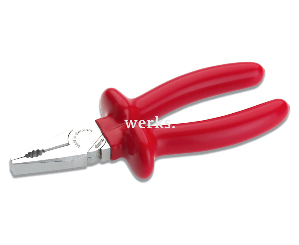 Диэлектрические комбинированные плоскогубцы (пассатижи) длиной 160 мм. Изготовлены из специальной закаленной инструментальной стали. Твердость индукционно закаленных режущих кромок составляет HRC 64. Обеспечивается точное и полное прилегание режущих кромок друг к другу. Рукоятки соответствуют стандартам VDE и безопасны для работы с элементами под напряжением до 1 000 В переменного тока. Они имеют многослойную защиту. При повреждении красного внешнего слоя рукояток становится видимым внутренний оранжевый слой, что указывает на отсутствие гарантированной изоляции в 1 000 В. Эти плоскогубцы предназначены для электромонтажных работ и резки различных типов проводов, включая рояльную струну.