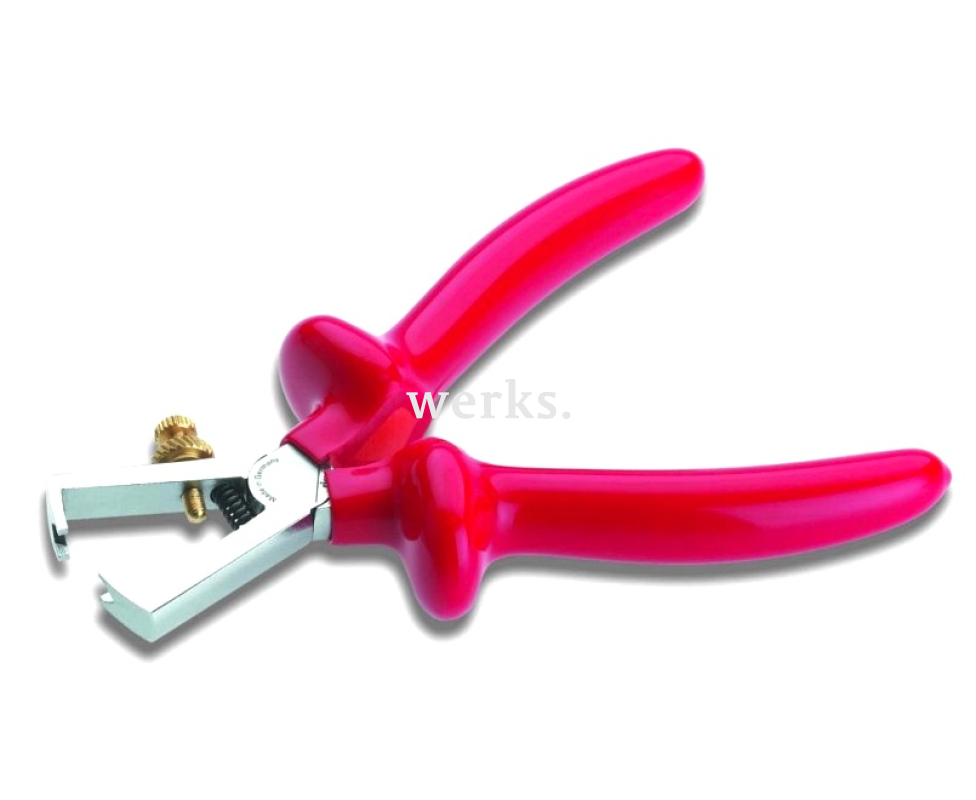 Диэлектрические клещи предназначены для снятия изоляции с одно- и многожильных проводов диаметром до 5 мм и сечением от 0.75 до 6 кв. мм. Благодаря регулировочному винту, инструмент легко адаптируется под необходимый диаметр кабеля. Устойчивый шарнир и пружины обеспечивают простое открытие губок. Эргономичные ручки соответствуют стандартам VDE и безопасны при работе с проводами под напряжением до 1 000 В переменного тока. В случае повреждения красного внешнего слоя изоляции ручек, становится виден внутренний оранжевый слой, что указывает на отсутствие гарантированной изоляции на уровне 1000 В.