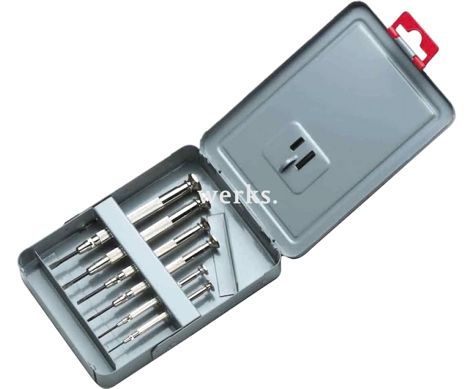 Набор из шести шлицевых отверток для часов, предназначенный для профессионалов. Идеально подходит для выполнения различных механических задач с мелкими крепежными элементами, особенно во время ремонта часов.