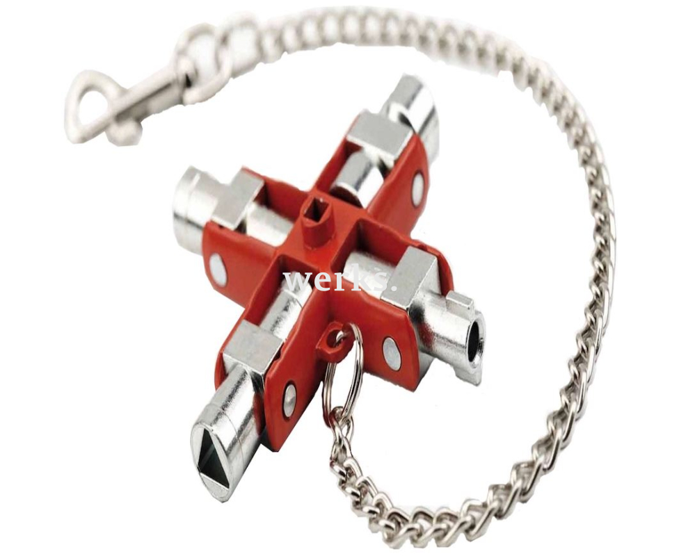 Универсальный инструмент SuBMaster идеально подходит для всех популярных приборных и распределительных шкафов, а также электрощитов. Благодаря вращающимся элементам, этот ключ сочетает в себе восемь различных типов ключей: - квадратные: 5, 6, 7-8, 9-10 мм; - треугольные: 7, 8-9, 10-11 мм; - круглые с ушками: 3-5 мм; - полукруглые (halfmoon): 6 мм. В центре находится выступ размером 5 мм, который позволяет использовать ключ для отопительных вентилей. Адаптер 1/4' дает возможность применять ключ в качестве битодержателя. Изготовлен из прочной инструментальной стали с защитным цинковым покрытием.