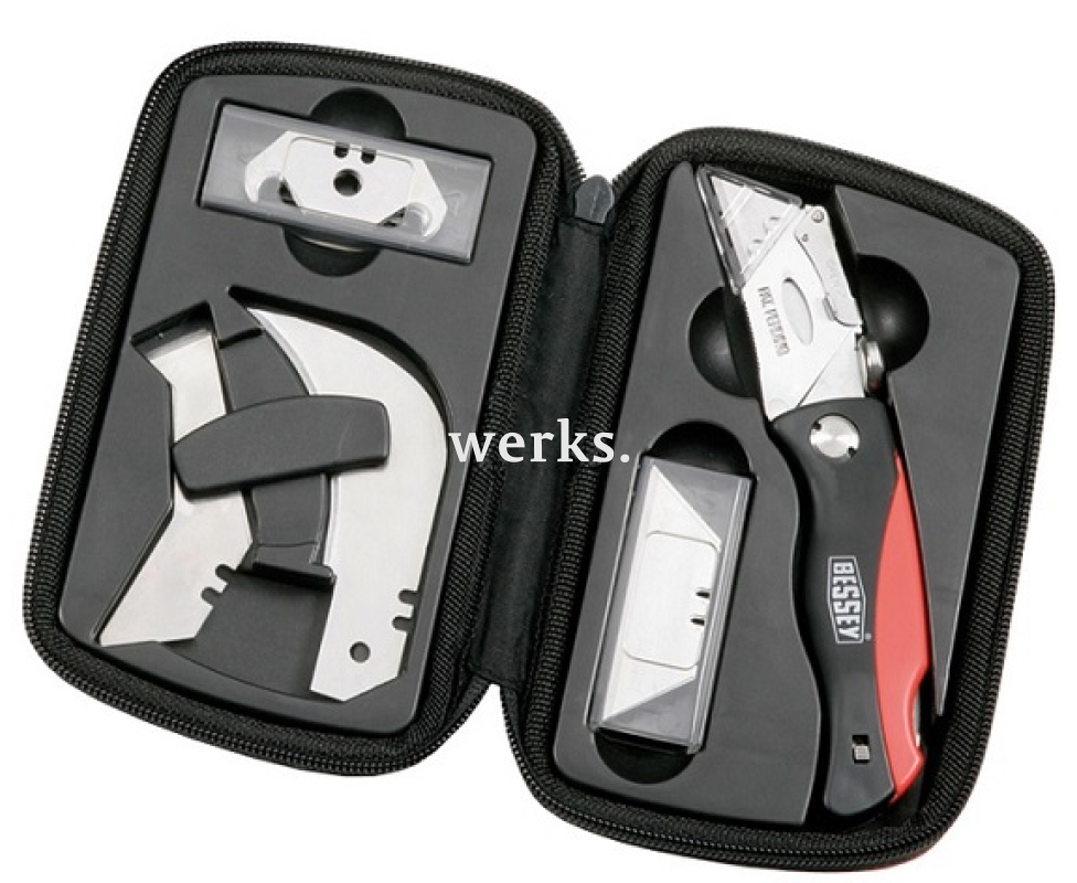 Профессиональный набор ножей DBK PH Erdi ER-DBKPH-SET включает в себя: складной нож DBKPH с ручкой из пластика; 10 трапециевидных лезвий DBK-T; 5 крючкообразных лезвий DBK-H; 2 лезвия для линолеума DBK-L; 2 лезвия-выколотки DBK-A. Все это удобно размещено в прочном нейлоновом чехле на молнии. Отличный выбор для монтажных работ.