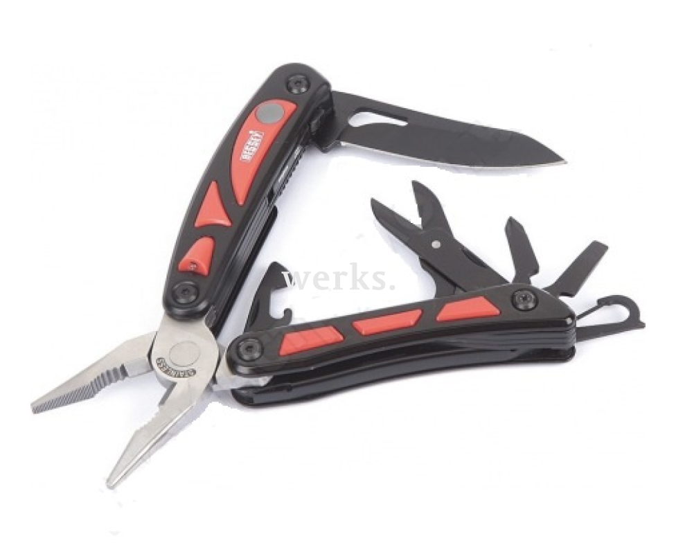 Профессиональный мультиинструмент с LED-подсветкой Erdi ER-DMTPL-A длиной 105/160 мм. Этот многофункциональный инструмент предлагает 10 различных функций: плоскогубцы, резак для проволоки, инструмент для зачистки, двусторонняя подсветка с выключателем, нож, отвертка с плоским шлицем, крестовая отвертка, карабин, ножницы и консервный нож. Идеальный выбор для домашних нужд и монтажных работ. Эргономичная ручка и лезвия из высококачественной нержавеющей стали обеспечивают комфорт в использовании. Запорный механизм позволяет работать одной рукой. Поставляется в прочной нейлоновой сумке с надежным креплением для ремня. Применяется для резки кожи, тросов, винила, тонкого кабеля, веревки, легкого пластика, картона, бумаги и закручивания винтов.