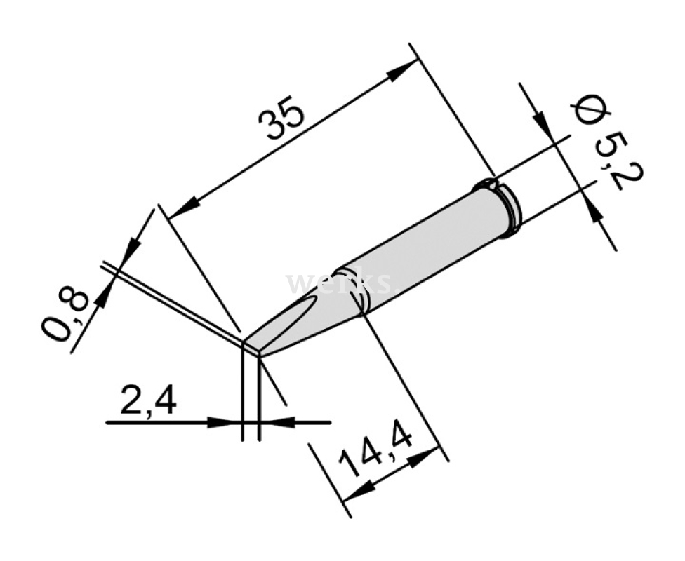 Сменное прямое жало для паяльников Ersa I-TOOL, I-TOOL NANO, I-TOOL PICO. Имеет форму усеченного конуса с обеих сторон и оснащено специальным покрытием, что способствует увеличению срока службы. Диаметр жала составляет 2,4 мм. Внешний диаметр обоймы равен 5,2 мм. Внутренний диаметр обоймы составляет 3,5 мм. Длина жала — 35 мм. Вес — 4 г. Сменное паяльное жало подходит для паяльников Ersa I-TOOL, I-TOOL NANO, I-TOOL PICO.
