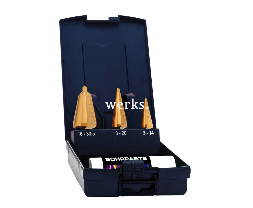В комплект входят 3 конусных сверла, покрытых титановым нитридом, с цилиндрическим хвостовиком, а также паста для сверления. Эти инструменты предназначены для сверления и раззенковки металлических листов, труб и профилей. Они не создают заусенцев. Поставляются в надежном пластиковом кейсе с защелкой. 05248