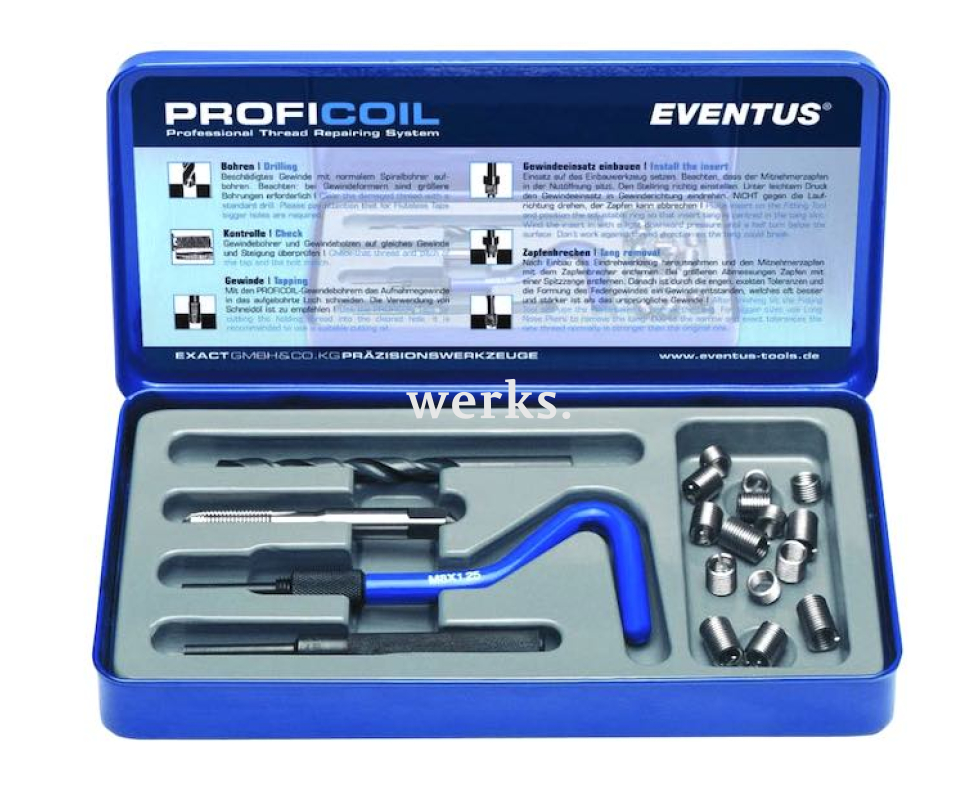 В комплект входят: спиральное сверло диаметром 8.3 мм и длиной 115 мм, метчик диаметром 9.62 мм и длиной 80 мм, завертка диаметром 5.7 мм и длиной 140 мм, оправка для цапфы диаметром 6.2 мм и длиной 110 мм, а также 15 резьбовых вставок (размеры Ø1, Ø1.5, Ø2.5). Упаковано в компактный стальной ящик, предназначенный для хранения и транспортировки.