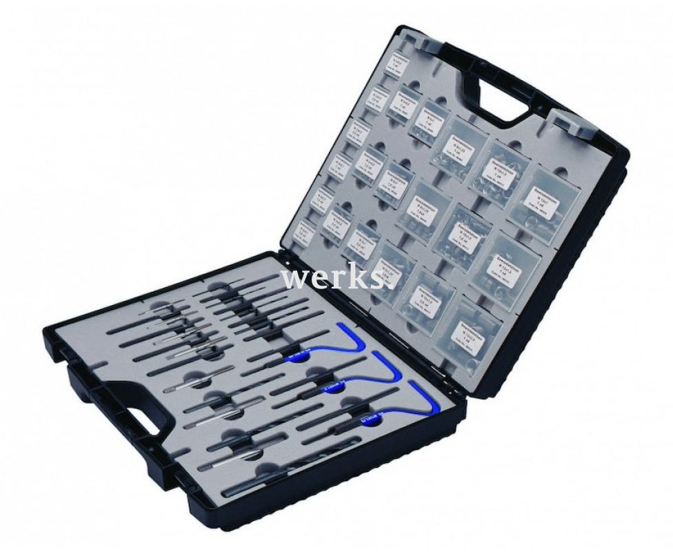 В комплект входят 7 спиральных сверл размером от М3 до М12 длиной 85-140 мм, 100 резьбовых вставок, 7 метчиков размером М3-М12 длиной 66-95 мм, 7 заверток размером М3-М12 длиной 104-150 мм и 7 оправок для цапф размером М3-М12 длиной 100-120 мм. С помощью спирального сверла удаляется старая поврежденная резьба, после чего новая резьба нарезается метчиком. Необходимая резьбовая вставка устанавливается с помощью завертки. Оправка используется для облома концевая цапфа. Благодаря допускам и форме резьбовой вставки создается новая резьба, которая полностью соответствует оригиналу. Набор состоит из 130 элементов и поставляется в прочном пластиковом кейсе, который удобно использовать для хранения и транспортировки.
